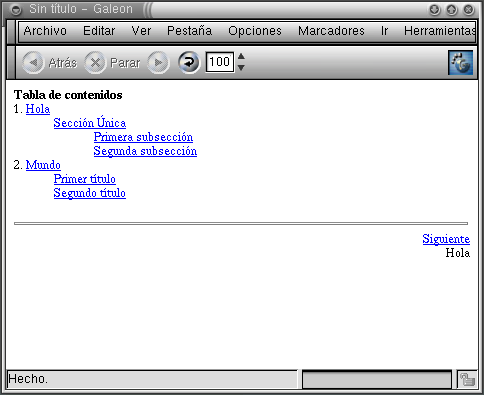 Dicha aplicación creará un directorio hola, en donde almacenará el conjunto de páginas que conforman su documento. La página principal contendrá la tabla de contenidos de su documento y se llamará book1.html. En nuestro caso dicha página luce de la siguiente forma
