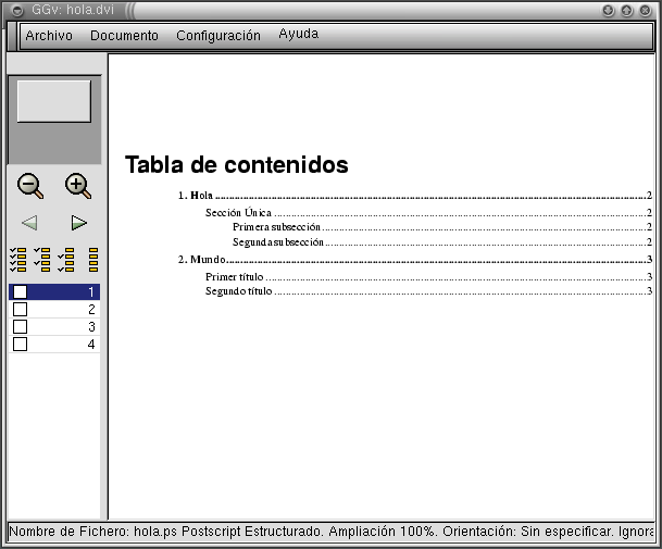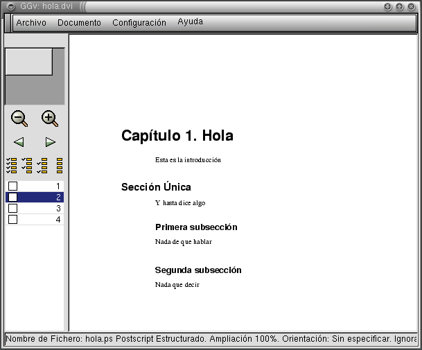 Esto generará el archivo hola.ps, el cuál puede ser visualizado usando GGv. Para verlo use M-! y digite ggv hola.ps &. Obtendrá una pantalla como la siguiente