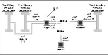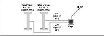 La Cervecera Virtual y la Vinatera Virtual poseen una subred de clase C cada una, de la subred de clase B de la cervecera, y la puerta de enlace de cada una, a través de la máquina vlager, que también soporta la conexión UUCP. Figura A-2 muestra la configuración.