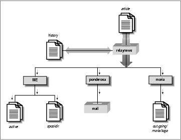 Figura 21-1 muestra las noticias fluyendo a través de relaynews. Los artículos deben ser transmitidos al servidor local (indicado por ME), a un servidor llamado ponderosa vía email, y a un servidor llamado moria, para el cual el proceso por lotes está activado.