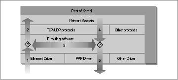 En nuestro diagrama, el flujo 1→3→5 representa nuestra máquina encaminando datos entre un 'host' sobre nuestra red Ethernet y un 'host' alcanzable vía nuestro enlace de PPP. Los flujos 1→2 y 4→5 representan los flujos de entrada y de salida de datos de un programa de red ejecutándose en nuestro 'host' local. El flujo 4→3→2 representaría un flujo de datos vía una conexión 'loopback'. Naturalmente, los datos fluyen tanto hacia dentro como hacia fuera de los dispositivos de red. Los símbolos de interrogación del diagrama representan los puntos donde la capa de IP realiza las decisiones de encaminamiento.