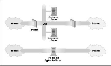 Sin embargo, típicamente los cortafuegos son máquinas únicas que sirven todas estas funciones. Esto es algo menos seguro, porque si hay alguna debilidad en la propia máquina del cortafuegos que le permita a alguien conseguir el acceso al mismo cortafuegos, la seguridad de toda la red habrá sido comprometida. Sin embargo, estos tipos de cortafuegos son más baratos y fáciles de mantener que la configuración más sofistificada descrita arriba. La Figura 9-1 ilustra los dos tipos más comunes de configuración de cortafuegos.