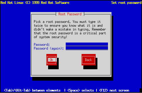 La clave de root debe tener al menos seis caracteres de longitud; la clave que escriba no se mostrará en la pantalla. Debe escribir la clave dos veces; si las claves no coinciden, el programa de instalación le pedirá que las escriba nuevamente.