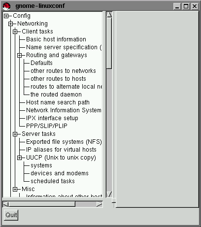 Las entradas que selecciones aparecerán en el panel que tienes a al derecha y permanecerán allí hasta que las cierres. Esto reduce mucho la profusión de ventanas que solía causar Linuxconf. Si acabas teniendo demasiadas cosas abiertas para tu gusto, simplemente pulsa en el botón Cancelar que hay en la parte inferior de cada ventana para cerrarla sin hacer cambios, o Aceptar para aplicarlos.