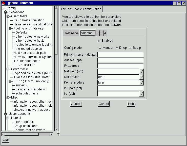 El primer campo en esta pantalla es una opción para indicar si este adaptador está activo o no. Debería estar marcado si es el que pretendes usar. Debajo suya tienes que elegir el Modo de configuración. Manual significa que vas a proporcionar tú mismo toda la información y la vas a meter a mano. DHCP y bootp obtienen su información de un servidor remoto del tipo correspondiente. Si no estás seguro de qué opción elegir, habla con tu administrador de sistema.