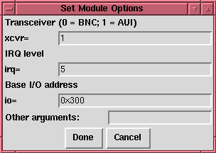 Para cambiar las opciones que se pasan a un módulo en el momento de cargarlo, pulsa en su línea para seleccionarlo, y pulsa después en el botón Edit. kernelcfg te mostrará una ventana como la de la figura fig:kerneld-edit. Las opciones de las que saber kernelcfg (normalmente todas las opciones disponibles) tendrán cada una su propio campo. Habitualmente ignorarás el campo Other arguments. Algunos módulos no suelen llevar argumentos; en otro caso, tendrán un campo Arguments que te permite introducir información de configuración.