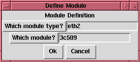 Si hay más de un módulo que pueda ser usado para el tipo que has elegido, verás otra ventana de diálogo (figura fig:kerneld-select) que te pedirá el módulo a usar, y puede que también el tipo de módulo; para ethernet, por ejemplo, necesitas elegir entre eth0, eth1, etc. Cuando hayas terminado, pulsa en Ok de nuevo para continuar especificando cualquier opción de módulos en la siguiente caja de diálogo (figura fig:kerneld-select), la misma que se usa para editar un módulo.