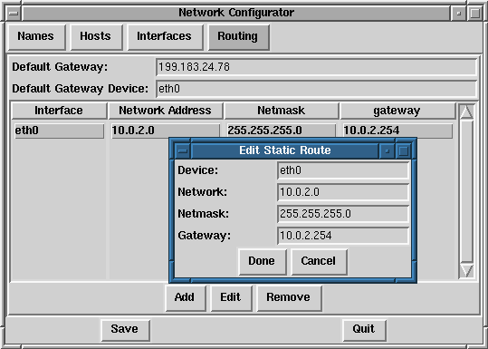 En la pantalla Routes management tienes la capacidad de agregar, editar o borrar rutas estáticas entre redes. Agregar o eliminar una entrada requiere acciones idénticas, al igual que con el panel Hosts. Aparecerá una ventana de diálogo; no tienes más que teclear la información y pulsar Done cuando hayas terminado. Véase la figura fig:netcfg-routes como ejemplo.