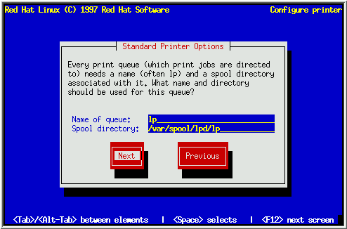 Una vez seleccionado un tipo de impresora, se le presentará una caja de diálogo titulada ``Standard Printer Options'' u Opciones de impresión estándar (vea la figura 36). Escriba el nombre de la cola de impresión y el directorio de intercambio (spoo) que quiera usar, o simplemente acepte la información mostrada allí.