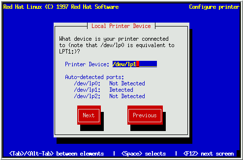 Escoja el nombre del dispositivo de impresora local en el campo provisto. Por conveniencia, el programa intenta determinar cuales puertos de impresora están disponibles en su computadora. Seleccione Next, y presione [Espacio]. Ahora vaya a la sección 5.6.4 para continuar.
