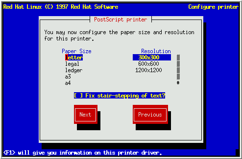 Después de seleccionar el tipo de impresora, verá una caja de diálogo similar a la de la figura 41. Ajuste el tamaño del papel y la resolución. La opción Fix stair-stepping of text (arreglar la impresión en escalera del texto) debe ser puesta si su impresora no hace un retorno de carro automático después de cada línea.