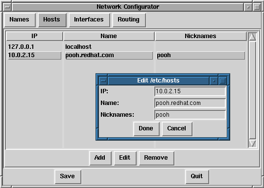 En el panel de getión Hosts tienes la posibilidad de añadir, editar o quitar máquinas del archivo /etc/hosts. Añadir o editar alguna de sus entradas tiene el mismo efecto. Una cuadro de diálogo aparecerá, simplemente tecleando la nueva información y haciendo click en Done habrás terminado. Mira la Figura 60 para ver un ejemplo.