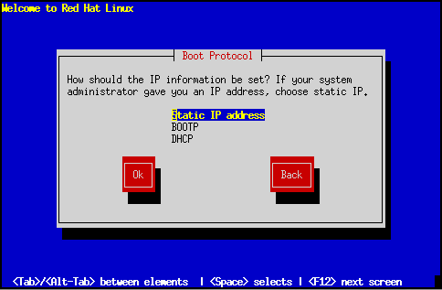 Una vez que el programa de instalación haya configurado su tarjeta de red, le mostrará varios diálogos para configurar la red TCP/IP de su sistema. La primera pantalla (mostrada en la figura fig:inst-tcpip0) le permite seleccionar una de entre las tres propuestas de configuración en red: