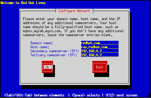Tras el primer cuadro de diálogo, puede ver un segundo cuadro. Este le solicitará un nombre de dominio, un nombre de host y otra información de red (véase la figura fig:inst-tcpip2). Introduzca el nombre de dominio para su sistema y pulse Enter; el programa de instalación lleva el nombre de dominio hasta el campo nombre de host. Introduzca el nombre de host que usa delante del nombre de dominio para formamar un nombre de dominio completamente calificado (FQDN). Si su red tiene más de un servidor de nombres, puede introducir las direcciones IP de los servidores de nombres adicionales en los campos Servidor de nombres secundario y Servidor de nombres terciario. Elija Ok para continuar.