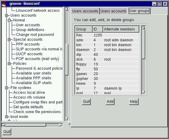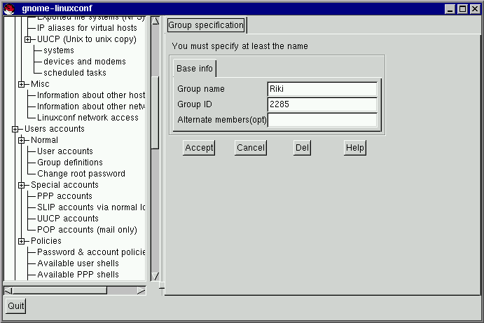 Introduce el nombre del grupo. Puedes especificar también los miembros del grupo en el campo Grupos adicionales. La lista de usuarios debería estar delimitada por espacios, lo que quiere decir que debe haber un espacio entre el nombre de un usuario y el siguiente. Cuando hayas terminado, selecciona Aceptar y se creará el grupo.