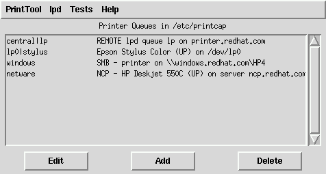 La herramienta de configuración de impresoras (printool) hace el mantenimiento del fichero /etc/printcap, los directorios de cola de impresión y los filtros para las impresoras. Los filtros te permiten imprimir varios tipos de ficheros, incluyendo: