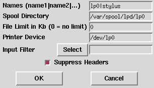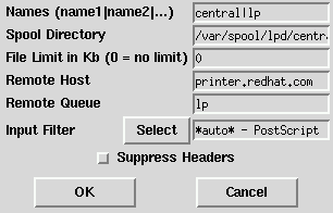 Después de elegir el tipo de impresora, una ventana de diálogo te pedirá más información acerca de la cola de impresión (véase la figura fig:printtool-addlocal). Todos los tipos de colas de impresión requieren la siguiente información: