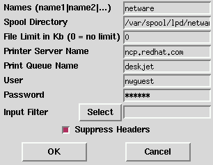 Atención: Si necesitas usar un nombre de usuario y clave para una cola SMB (LAN Manager) o NCP (NetWare), serán guardadas sin encriptar en un archivo en tu máquina local. Por lo tanto, es posible que otra persona acceda a esos nombre y clave. Por lo tanto, es recomendable que el nombre de usuario y la clave para usar la impresora sean diferentes que los de las cuentas del sistema Red Hat Linux local, de manera que el único compromiso en materia de seguridad pueda producirse en un uso no autorizado de la impresora. Si estás compartiendo ficheros de un servidor SMB, se recomienda también que estas unidades compartidas tengan una clave de acceso diferente a la de la cola de impresión.