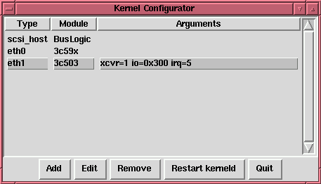 La herramienta mostrada en la figura fig:kerneld controla el fichero de configuración de kerneld. Mientras que kerneld puede cargar ciertas cosas, como sistemas de archivos, sin configuración explícita, necesita que se le diga qué soporte de hardware cargar cuando se le presente una petición específica.