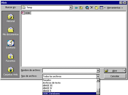Conexión remota a MySQL con MS Access Vamos a ver como conectarnos a una base de datos MySQL que está en un servidor remoto mediante un cliente Windows con MS Access. Para ello deberemos tener instalado en nuestro cliente Windows el driver MyODBC. Lo primero, es lo primero, arrancar MS Access, después en el menú "Archivo", pinchamos en "Abrir", con lo que se nos abre la, pinchamos en "Abrir", con lo que se nos abre la caja de diálogos "Abrir" y en campo "Tipo de archivo" seleccionamos "ODBC Databases".
