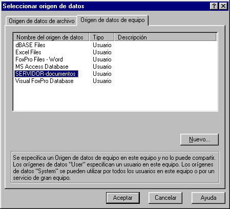 Ahora debemos seleccionar el origen de los datos (la conexión) al que nos vamos a conectar, pinchamos en la lengüeta de "Origen de datos de equipo" y escogemos el "Windows DNS name" que bien creamos en la instalación de MyODBC o desde el Panel de Windows en "Control en Fuente de datos ODBC".