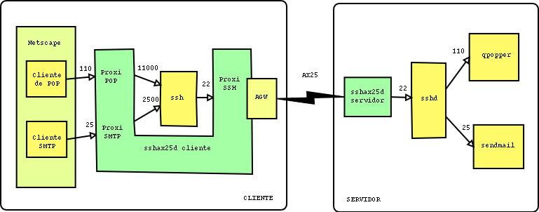 Las aplicaciones en el cliente se configuran apuntando a un proxi local de SMTP y POP (puertos 25 y 110). Este proxi detecta las conexiones, lanza un cliente de SSH escuchando en puertos trasladados (2500 y 11000) y redirige los datos de los puertos originales a los trasladados. El cliente de SSH multiplexa, comprime y cifra los datos que recibe y los manda a otro proxi local escuchando en el puerto de SSH (22). Su función es repetir por el canal AX.25 todos los datos de la comunicación SSH. En el servidor otro proxi similar intercambia datos entre el socket AX.25 y otro TCP, donde está el servidor SSH demultiplexor. Fontanería complicada, pero eficiente y extensible a cualquier aplicación cliente/servidor basada en TCP. La figura muestra un esquema de ella: