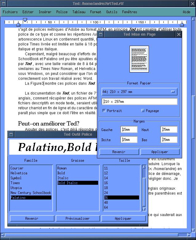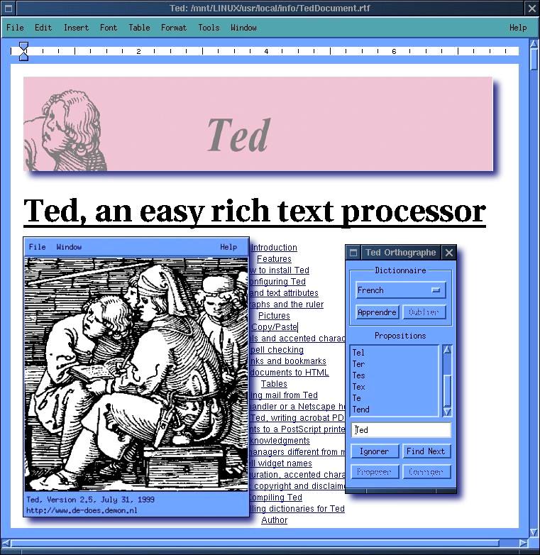 Ted ist ein produktives, leichtes und schnelles Werkzeug, dass angenehm zu benutzen ist und in der 2.5 Version sehr stabil ist. Ich habe bemerkt, dass es sich einfach ohne Vorwarnung schliesst, wenn man die Entf-Taste benutzt hat um leere Zeilen zu entfernen, was zu vielen Sicherheitsabspeicherungen zwingt. Doch dieses mindere Problem war mir nicht in der Version 2.3 aufgefallen. Man kann eine automatische zeitabhängige Sicherung vermissen. Man kann ebenfalls das Fehlen von Blocksatzausrichtung bemerken sowie den Aufbau des Textes in Spalten oder das Umfliessen eines Bildes durch den Text, was aus Ted ein gutes Satzprogramm machen würde. Meinerseits würde ich mir eine Übersetzung auf GTK und QT wünschen was einen GTed und einen KTed geben würde, die man in Gnome und KDE integrieren könnte. Aber um ehrlich zu sein ist Ted ein exzellentes Werkzeug. Dieser Artikel, sowie die anderen die ich aufgesetzt haben wurden alle mit Ted geschrieben. Und soviel ich weiss, haben die Verleger nie Probleme gehabt sie in ihrer professionnelle Publishingsoftware zu integrieren. Das heisst vieles.