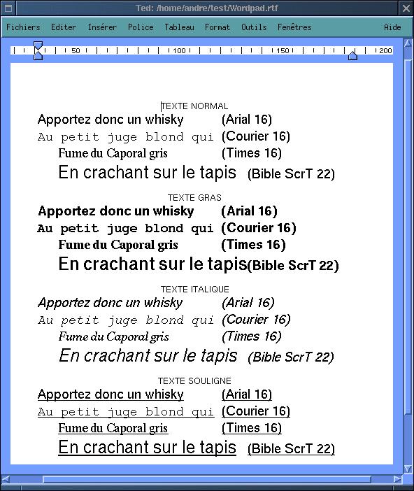 Nach der Installation hat Ted vier Schriften zur verfügung: Times, Helvetica, Courrier und Symbol. Es handelt sich um metrische Schriften von Adobe, die im AFM Format sind; im Prinzip kann Ted je Schrift dieses Typus benutzen und da die Verzeichnisse /usr/share/enscript oder /usr/share/ghostscript eines Linux-Verzeichnissbaums eine menge besitzen, ist der Wunsch sie zu benutzen gross, vor allen Dingen da die mitgelieferte Schrift Times in der Grösse auf 18 Punkte beschrenkt ist, genauso wie die Courier Kursiv und Fett Kursiv.