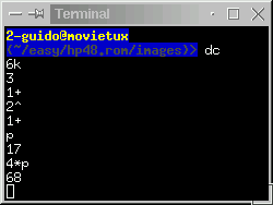 | Site: | Fait partie de tous les systèmes Unix. Sous Linux, le paquetage pour dc est appelé bc |