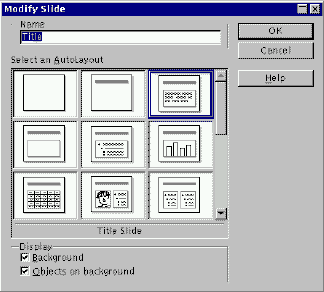 99% aller Dias, die wir erstellen, sehen sehr ähnlich aus: sie haben einen Titel und dann wahrscheinlich einen Text in der Art einer Liste von Themen. Hierfür nur einen Tastendruck zu benötigen, ist besser als deren zwei zu brauchen. Presentation (StarImpress, Anm.d.Ü.) erlaubt uns, in einem Fenster eine Kombination verschiedener Standardstrukturen auszuwählen. Die Struktur eines einzelnen Dias läßt sich jederzeit verändern.