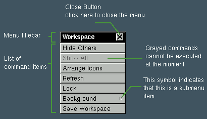 Los menús proveen una lista de órdenes que puede ejecutar. Para ejecutar una orden listada en un menú, pulse con el puntero del ratón en el elemento correspondiente. El elemento parpadeará diciendo que la orden será ejecutada.