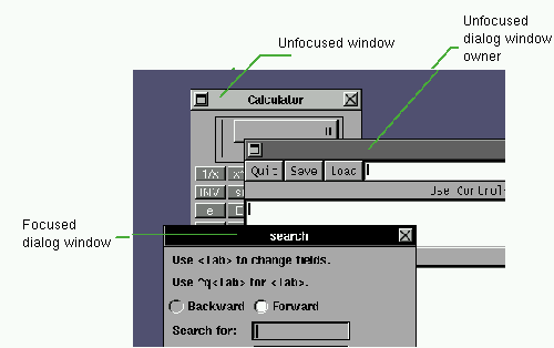 Las ventanas pueden estar en dos estados: con foco, o sin foco. La ventana con foco (también llamada la ventana clave o activa) tiene una barra de título negra y es la ventana que recibe la entrada del teclado, ie: donde puede escribir texto. Usualmente es la ventana donde trabaja. Sólo una ventana puede estar con foco a la vez.Las ventanas sin foco tienen una barra de título en gris.