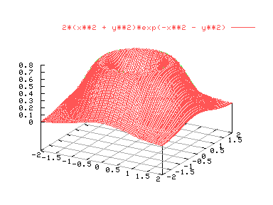splot [-2:2] [-2:2] 2*(x**2 + y**2)*exp(-x**2 - y**2)