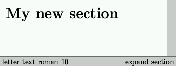 Dependiendo del estilo del documento, un texto suele estar dividido en capítulos o en secciones. Para empezar una nueva sección hacemos clic en el menú Texto -> Sección o bien escribir directamente \section seguido de ENTER en el canvas. En cualquiera de los dos casos se puede ver como cambia el entorno TeXmacs: