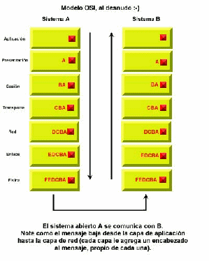 El modelo OSI1 está compuesto de siete capas, cada una de las cuales es recorrida de arriba abajo, las cuales permiten la comunicación entre una aplicación y otra: