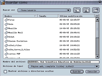 A este respecto, comentar únicamente que las páginas web no son bloques de contenido similares a los documentos de texto, sino que son una especie de mecano compuesto por texto, gráficos, sonidos, animaciones , ... que el navegador se encarga de 'montar' en nuestra pantalla. Por eso cuando almacenamos una página web en nuestro disco duro se almacena un documento con el nombre de la página y todos los elementos que hacen falta para 'montar' esa página). Este proceso es transparente para el usuario, es decir, cuando hagamos click sobre la página que hemos almacenado se mostrará tal y como la vimos en Internet. Pero es conveniente saber cómo está almacenada la página en nuestro disco