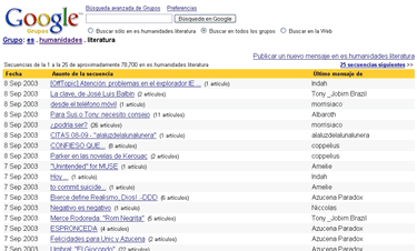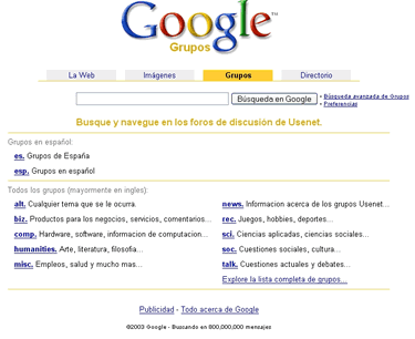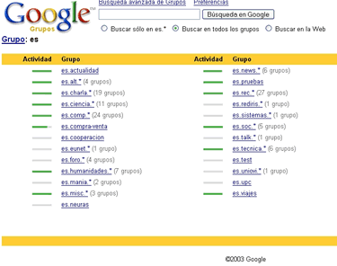1. Al seleccionar la pestaña grupos de Google accedemos al primer nivel de clasificación. En este nivel aparecen, al principio, las dos ramas que contienen los grupos en español (es. y esp.). Hacemos click sobre es., por ejemplo.