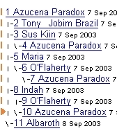 5. Y aquí está la cadena de mensajes. En la parte izquierda de la pantalla podemos ver la estructura que comentaremos en la siguiente imagen y en la parte derecha los mensajes propiamente dichos. | 6. Aquí tenemos la típica cadena de mensajes. La tabulación de ellos indica a qué mensaje se está repondiendo. Así, Azucena fue la que inició la cadena y en ella respondió a Sus Kiin y a O'Flaherty cuando éste respondió a María y cuando respondió a Indah | |