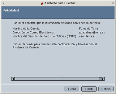5. Para finalizar sale un resumen con los datos de configuración. Si alguno está mal, podemos volver a la pantalla adecuada y modificarlo. Una vez correctos los datos pulsamos en Finish para acabar. | 6. Y ya tenemos aquí la pantalla inicial de Mozilla Mail, listo para acceder a los foros.