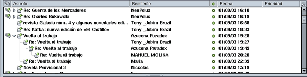 6. Al hacer click sobre uno de los foros, Mozilla Mail descargará del servidor los mensajes de dicho foro, que aparecerán en la parte superior derecha de la parte central del programa. Vemos como algunos mensajes llevan el triángulo a su izquierda que indica que esa rama puede expandirse, en este caso significa que ese mensaje tiene respuestas. Expandamos una de esas ramas. |