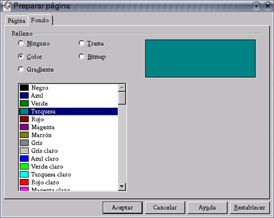 En la ventana que se nos abre, en la pestaña Página tenemos la posibilidad de elegir entre distintos formatos de papel, márgenes, orientación de la página; y en la pestaña Fondo (la que nos interesa especialmente ahora) podemos elegir la opción Color y al hacer esto se nos abre un menú de colores de fondo disponibles (una diapositiva con fondo blanco es un poco sosa, aunque no sé lo que diría Pocholo de esta afirmación). Particularmente siento especial predilección por el turquesa, así que podemos elegir ese color. Al seleccionarlo y pinchar en Aceptar se nos abre una ventana que nos pregunta si el color elegido va a ser el de todas las diapositivas, a lo que podemos responder Si o No, según veamos nosotros.