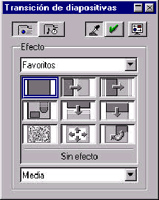 Si queremos que la transición entre diapositivas sea diferente al simple cambio automático entre una y otra cuando pulsamos ENTER o cliqueamos con el ratón, se pueden insertar transiciones entre diapositivas más interesantes. Esto se realiza mediante la acción Presentación->Transición de Diapositiva. Aparecerá una cuadro emergente (el de la figura) en el que podemos elegir la que más nos guste.