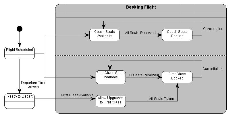 Por ejemplo, un comportamiento de un objeto se modela en términos de en qué estado está inicialmente, y a qué estado cambia cuando recibe un evento en particular. También modelas qué acciones realiza un objeto en un estado en concreto.