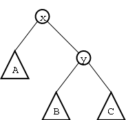 Miremos por un momento el árbol de Figure 3. Dado que este es un árbol de búsqueda se debe cumplir x < y y además todos los nodos del subárbol A deben ser menores que x y y; todos los nodos del subárbol B deben ser mayores que x pero menores que y; y todos los nodos del subárbol C deben ser mayores que y y por lo tanto que x.