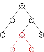 Veamos un ejemplo concreto. Deseamos insertar el número 3 en el árbol de enteros de Figure 5. La inserción se muestra punteada en Figure 6. Sin embargo, como puede verse, la inserción a provocado la pérdida de la propiedad de equilibrio del árbol ya que dicha propiedad no se cumple en el nodo marcado con rojo. ¿Qué hacemos para recomponer dicha pripiedad? Simplemente realizamos una rotación simple. En este caso se dice que la rotación es izquierda ya que la "pérdida de equilibrio se produce hacia la izquierda. En Figure 7 puede verse el árbol luego de la rotación: la propiedad de equilibrio ha sido reestablecida. Como mostramos atrás, la rotación conserva el orden entre los nodos, por lo que podemos afirmar que este último árbol si es AVL.